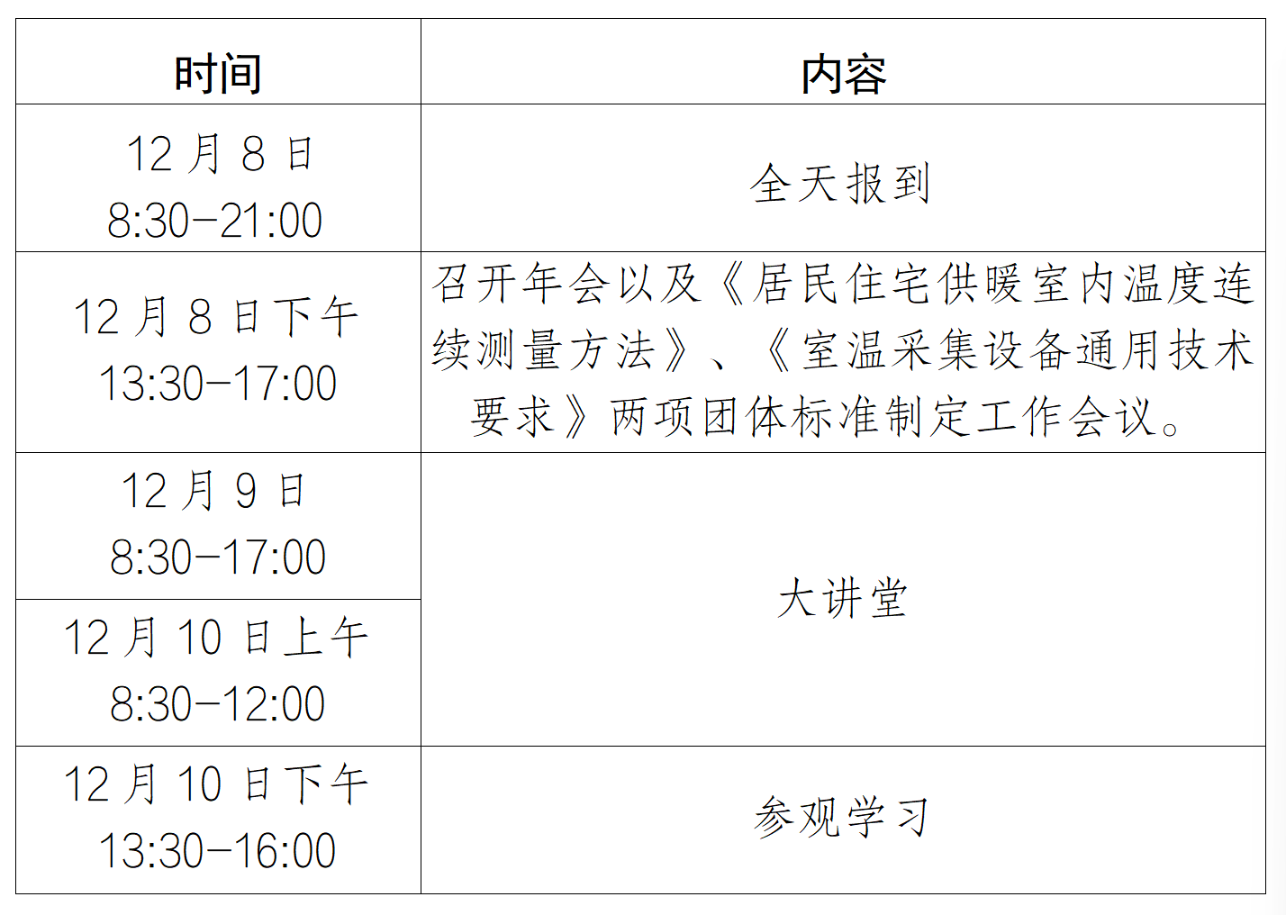 关于举办城镇供热技术公益大讲堂(第八期)暨中国建筑节能协会城镇智慧供热专业委员会2025年年会的通知 各相关单位:       为促进供热企业智慧化节能改造,提升供热系统运行能效,提高供热企业管理、技术人员业务水平和热用户满意度,中国建筑节能协会城镇智慧供热专业委员会定于12月8至10日在哈尔滨市举办“城镇供热技术公益大讲堂(第八期)暨中国建筑节能协会城镇智慧供热专业委员会2025年年会”。年会主题为“聚焦人工智能在复杂供热系统场景应用,建设清洁低碳、安全智慧新型供热系统”。大讲堂将邀请供热行业知名专家、具有代表性的供热企业技术负责人和先进适用技术产品研发生产单位技术负责人为主讲老师。相关通知如下: 一、时间和地点 时间:12月8日至10日 地点:哈尔滨市(具体开会地点另行通知) 二、组织机构 主办单位: 中国建筑节能协会城镇智慧供热专业委员会 支持单位: 哈尔滨市住房和城乡建设局供热管理处 黑龙江省寒区低碳智慧供热工程技术研究中心 哈尔滨市城市供热协会 承办单位: 北京国立维科技发展中心 协办单位: 国能哈尔滨热电有限公司 哈尔滨物业供热集团有限责任公司 三、日程安排  四、主要内容 大讲堂主要授课内容如下: 1、低碳柔性智慧供热系统构建 2、人工智能在复杂供热系统场景中的工程应用 3、零碳园区项目建设及关键技术 4、集中供热系统碳排放预测与碳市场交易 5、供热系统智能决策关键技术 6、供热系统数据治理与智能调控关键技术 7、供热系统安全可靠性提升 8、供热系统运行调控实用技术 9、换热站和庭院管网智能化节能改造技术 10、智慧供热系统案例分享和运行调控经验交流 五、参会说明 大讲堂为公益性质,不收取任何费用。行业主管部门、供热公司、设计机构、科研院所、大专院校等相关人员均可免费参加,并邀请相关单位组织报名,报名表见附件,填写后发送至报名邮箱。差旅和食宿自理。 六、联系方式 联系人:白羽、迟妍、朱玉莲、周立 联系电话:010-80362920  13693698822 活动监督:010-57811501 报名邮箱:zhihuigongre@126.com 附件:城镇供热技术公益大讲堂(第八期)暨中国建筑节能协会城镇智慧供热专业委员会2025年年会报名表 中国建筑节能协会城镇智慧供热专业委员会 2025年10月29日 有新产品展示、新技术分享的企业请与会务组提前确认。 第八期大讲堂文件百度网盘下载地址: