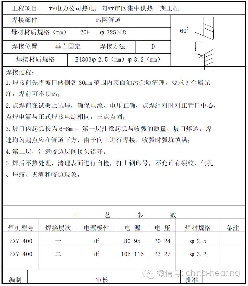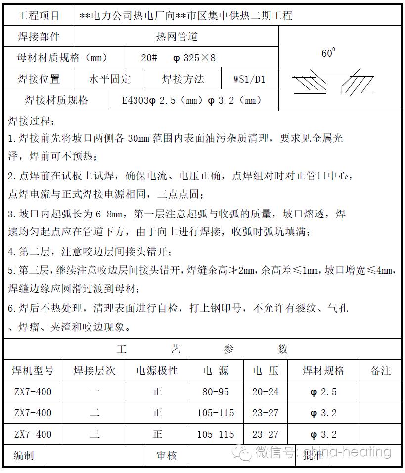 ⑵焊接工艺措施 ① 无缝管对接采用 E4303 焊条,φ325×8 的焊接,详见工艺卡 焊接工艺卡