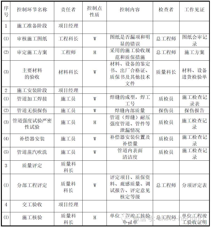 (二)工程质量控制点 W-代表见证点 H-代表停止点 E-代表检查点 1.管道安装工程质量控制点